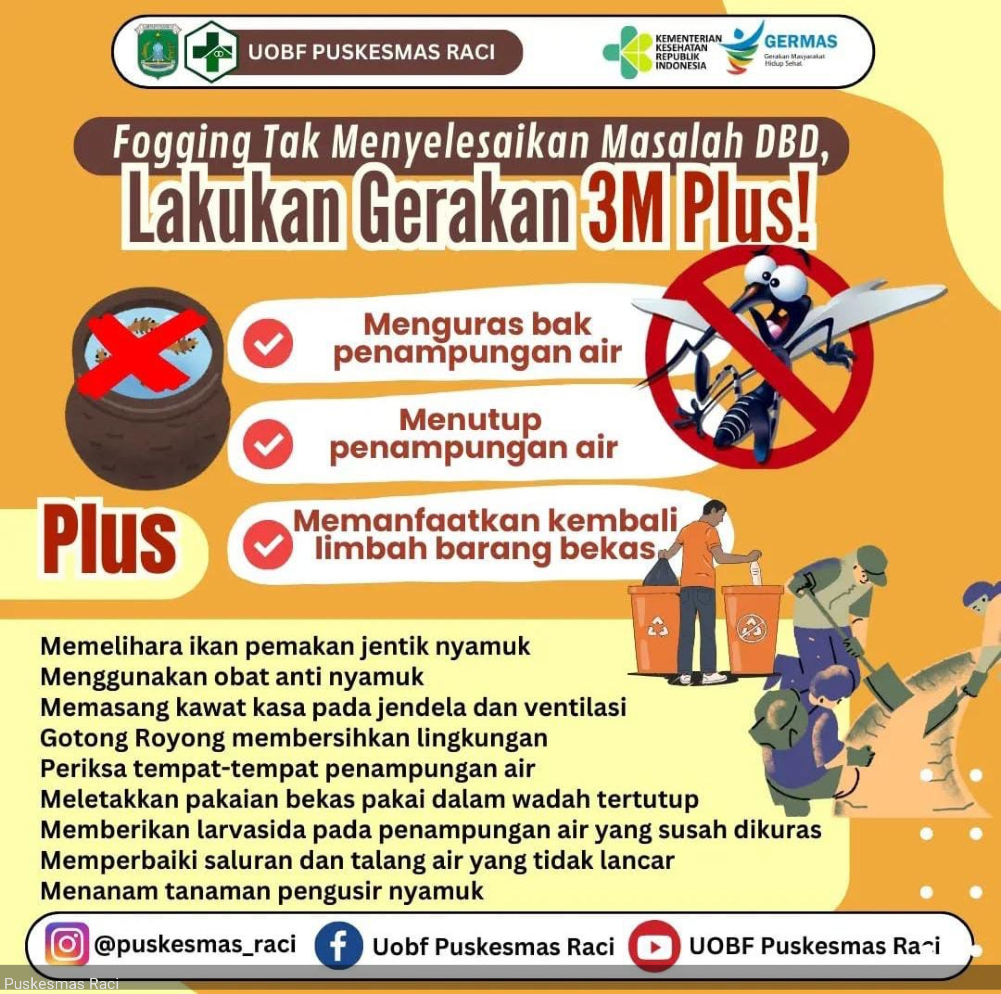 Gerakan 3M Plus merupakan upaya untuk mencegah penyebaran demam berdarah dengue (DBD) dengan cara menguras, menutup, dan mengubur barang bekas yang bisa menjadi tempat perkembangbiakan nyamuk, serta melakukan tindakan "plus" untuk perlindungan diri dari gigitan nyamuk.